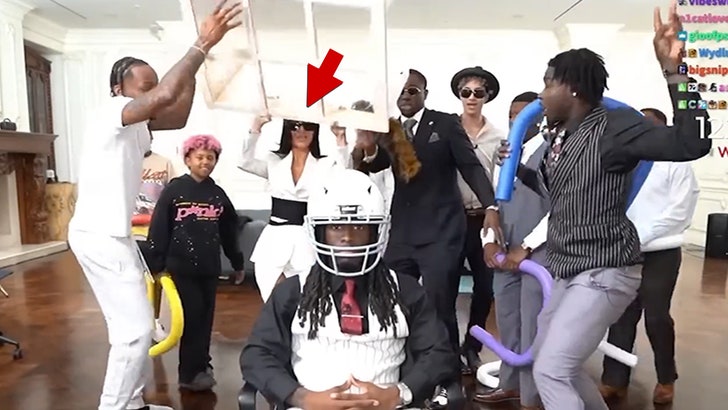 Kim walked in first … wowing Cenat and his crew in a swanky white suit and fresh pair of shades. She hung out with them for about 30 minutes before jumping into Cenat’s “Extreme Noodle Game” — and that’s when the fun really starts.