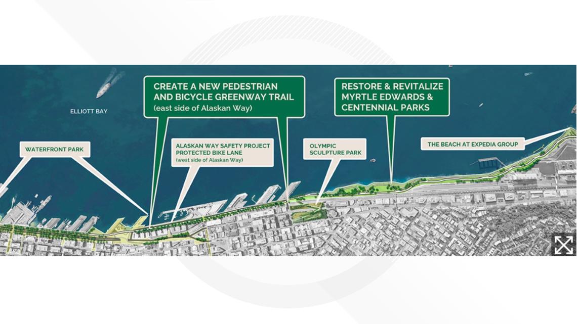 The $800 million Waterfront Seattle project rebuilt Alaskan Way between South King and Pike streets, added Elliott Way from Alaskan Way to Bell Street, and created a two-way protected bike lane and a waterfront promenade along Alaskan Way. The project also rebuilt Seneca Street between Western Avenue and Alaskan Way, and Columbia Street between First Avenue and Alaskan Way, with new parking, landscaping and lighting.